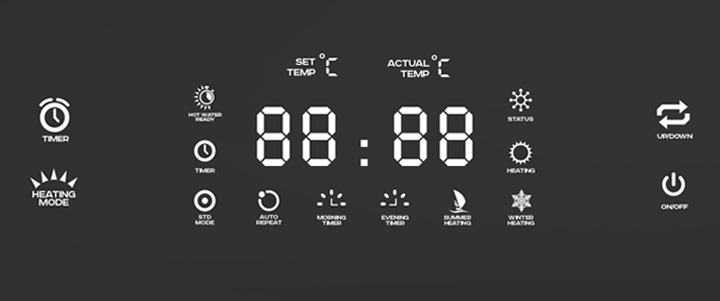 Все настройки водонагревателя отражаются на стильном, очень большом LED-дисплее: текущая и установленная температура воды, зимний или летний режим нагрева, установленный таймер (утренний или вечерний) и прочие установленные режимы работы.